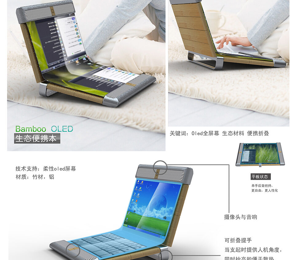 设计理念:借助科技,以生态材料为切入点。整合不同模式的电脑使用状态。