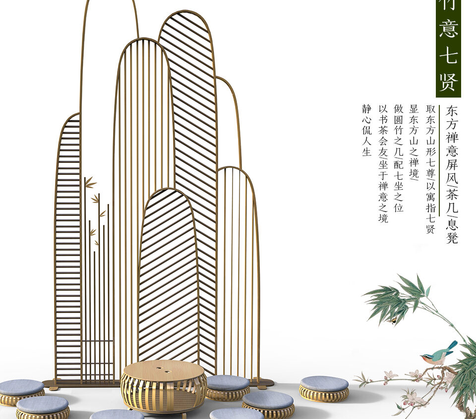 《竹意七贤》的设计灵感来源于东方水墨里抽象的山形。用七座禅意的山来代表竹林七贤的典故,也用来寓意使用者的智慧。用屏风,茶几和息凳来构成一组具有东方美学意义的竹的作品,用当代的艺术手法,来体现古典美学中的东方智慧。