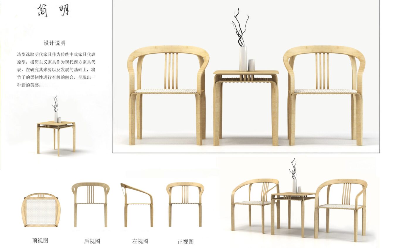 造型选取明代家具文化,极简主义家具作为现代代表,研究其来源以及发展的基础上,将竹子的柔韧性进行有机融合,呈现出新的美感。
