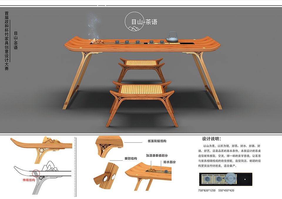 以山为意,以形为镜,好茶、好水、好器、好境、好艺,这是品茗的基本条件,本案设计的茶桌造型赋有雅致,空灵,禅一味的美学意境,让茗茶与家具相辅相成的绝佳搭配,造型简洁。新颖的结构更突出竹材的美,适合量产。