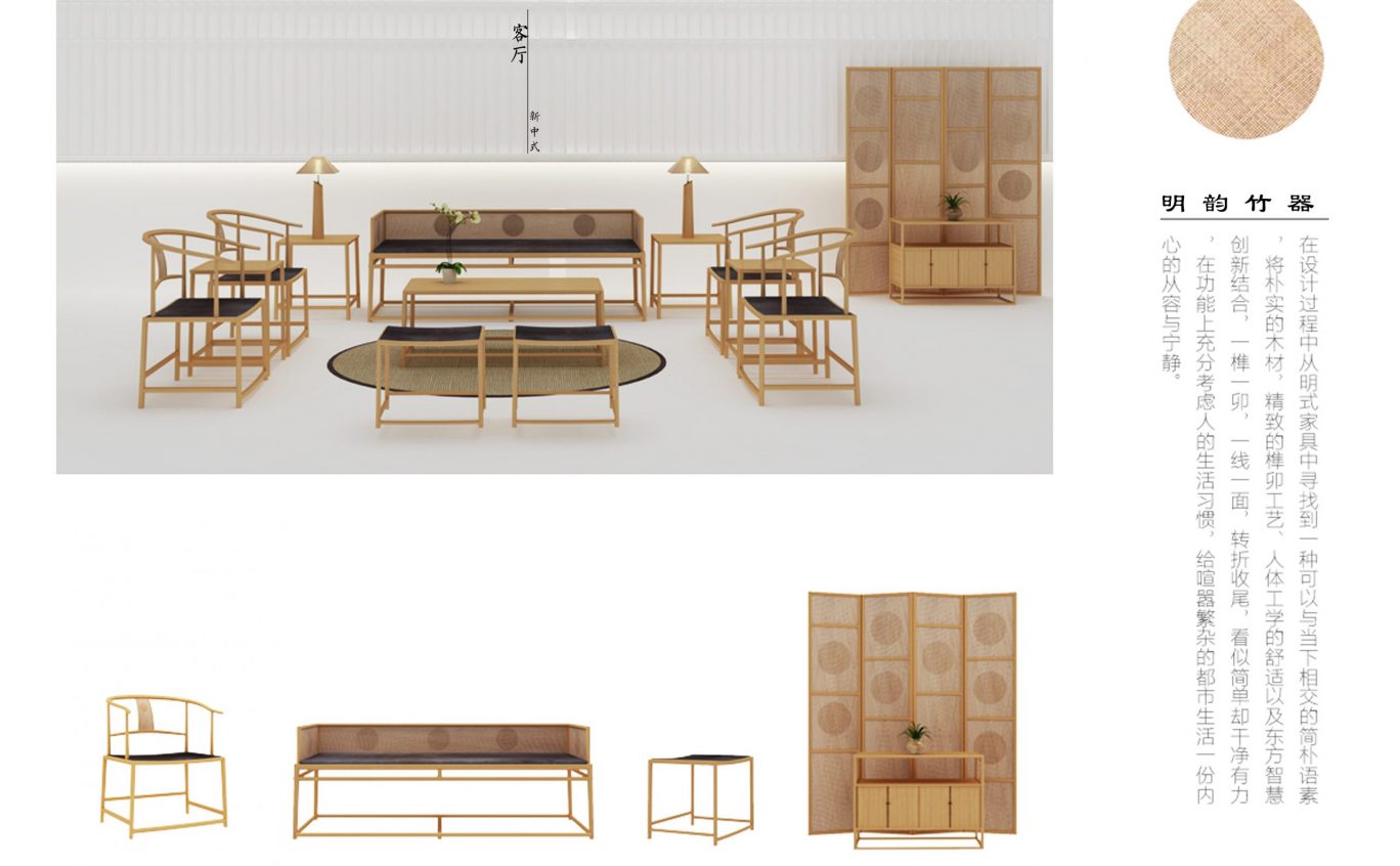 在设计过程中从明式家具中寻找到一种可以与当下相交的简朴语素,将朴实的竹材,精致的榫卯工艺、人体工学的舒适以及东方智慧创新结合整体家具采用竹木结合方式,结点处采用榫卯结构或木销结构,装饰部分采用手工竹编完成。