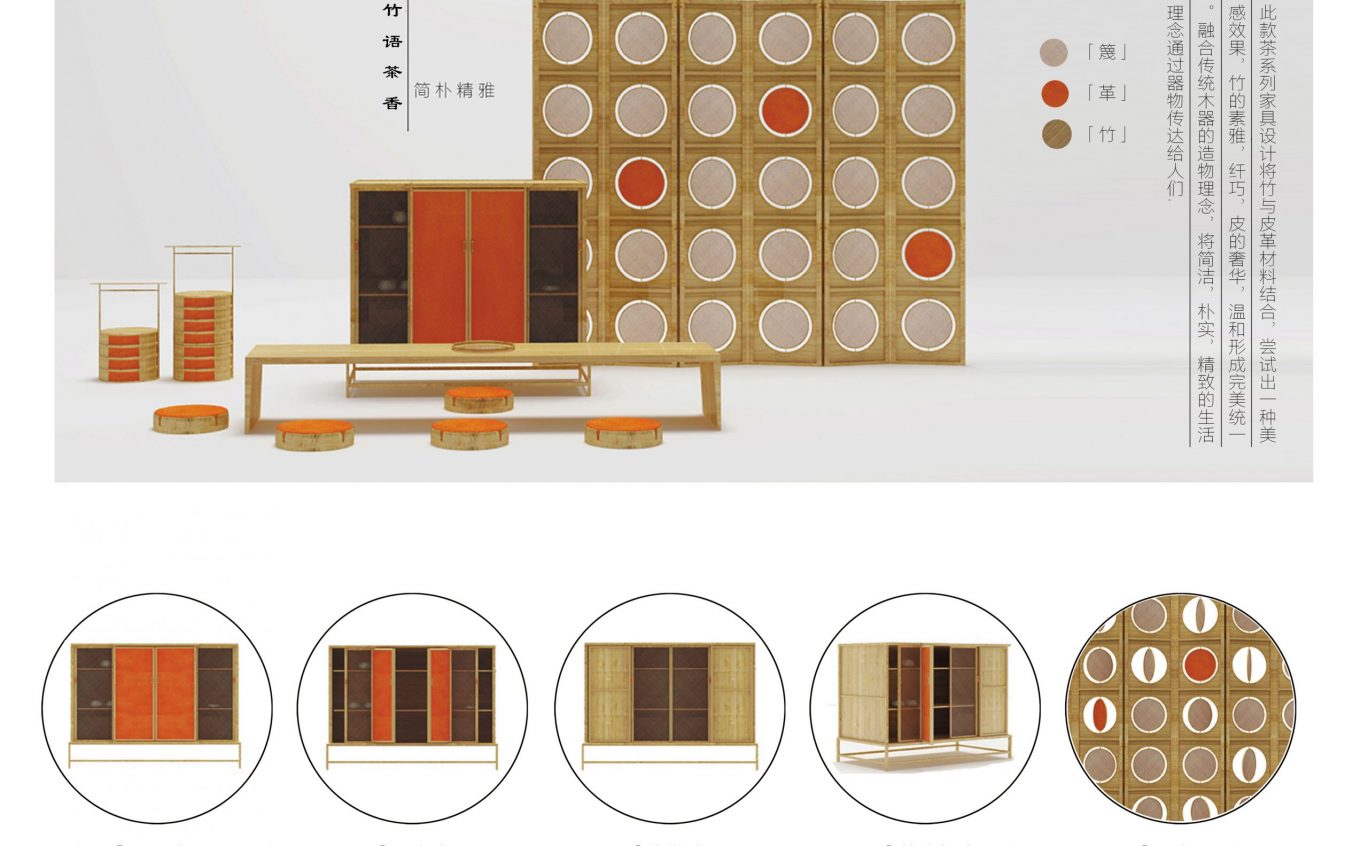 此款茶系列家具设计将竹与皮革材料结合,尝试出一种美感效果,竹的素雅,纤巧,皮的奢华,温和形成完美统一 。融合传统木器的造物理念,将简洁,朴实,精致的生活理念通过器物传达给人们。