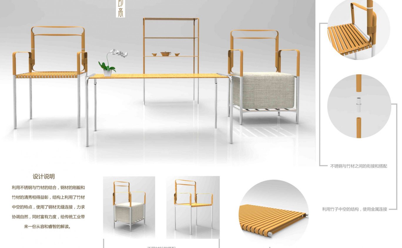 这套家具利用不锈钢与竹材的结合,钢材的刚毅和竹材的清秀相得益彰,在结构上利用竹子中空的特点,使用钢材作为连接件无缝衔接,节节而高升,赋予了其美好的寓意,整体设计力求协调自然,同时又富有力度,给传统工业带来一份从容和睿智的解读。