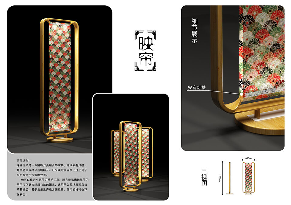 这件作品是一件隔断灯具结合的家具,两端安有灯槽,是由竹集成材和丝绸结合。灯光映射在丝绸上也起到了照明和烘托气氛的效果。 他可以作为小范围的照明工具。而且根据场地氛围的不同可以更换丝绸花纹的图案,适用于各种场所而且简单易拆装,易于批量生产也方便运输,使用的材料也环保安全。
