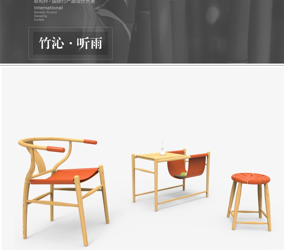 互联网+是一种年轻的模式,同样也是年轻人选择的 生活方式。传统的中式家具虽然经典,但在这一代人 心中已谈谈健忘。如何留住我们的文化!让千年故事 继续延续,我们要思考更多。生活、方式、质感、视 觉、购买等等。此产品为一套以竹木板和皮质为材料 的新中式家具设计,形态上沿用中式文化,结构上利 用拆卸方式,更加符合现代产品的包装、运输以及组 合。文化是什么?或许就是物的传承和使用,我们一 直在探索,我们一直在寻找,找到一种适合未来群体 能够生活与消费的产品,这可能也将成为中国未来的 新文化,一种东方的新美学……