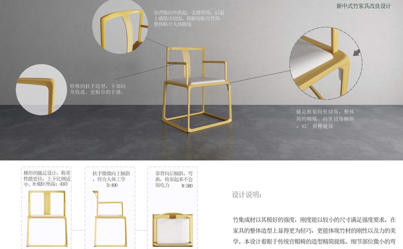 竹集成材以其极好的强度,刚度能以较小的尺寸满足强度要求,在家具的整体造型上显得更为轻巧,更能体现竹材的刚性以及力的美学。本设计着眼于传统官帽椅的造型精简提炼。细节部位微小的弯曲,倾斜,使得更加贴合人体,提高舒适度。