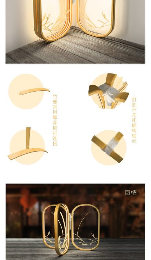这款“窗情”装饰灯的结构由三片竹框架组成,以灯的开关作为旋转中心。这款灯有着收纳功能可以通过旋转改变灯的造 型来适应不同环境。不仅能改变灯光的亮度,而且还可以改变光照射的范围。灯的每片竹蔑通过传统榫卯锁扣的方式与竹 框连成一体。当你慢慢转开灯时,宛如推开窗户望着外景,屋内的烛光照射到窗外的树梢上构成了一幅美丽写意的画面, 仿佛时光流逝回到过去传达着浓浓的情意。
