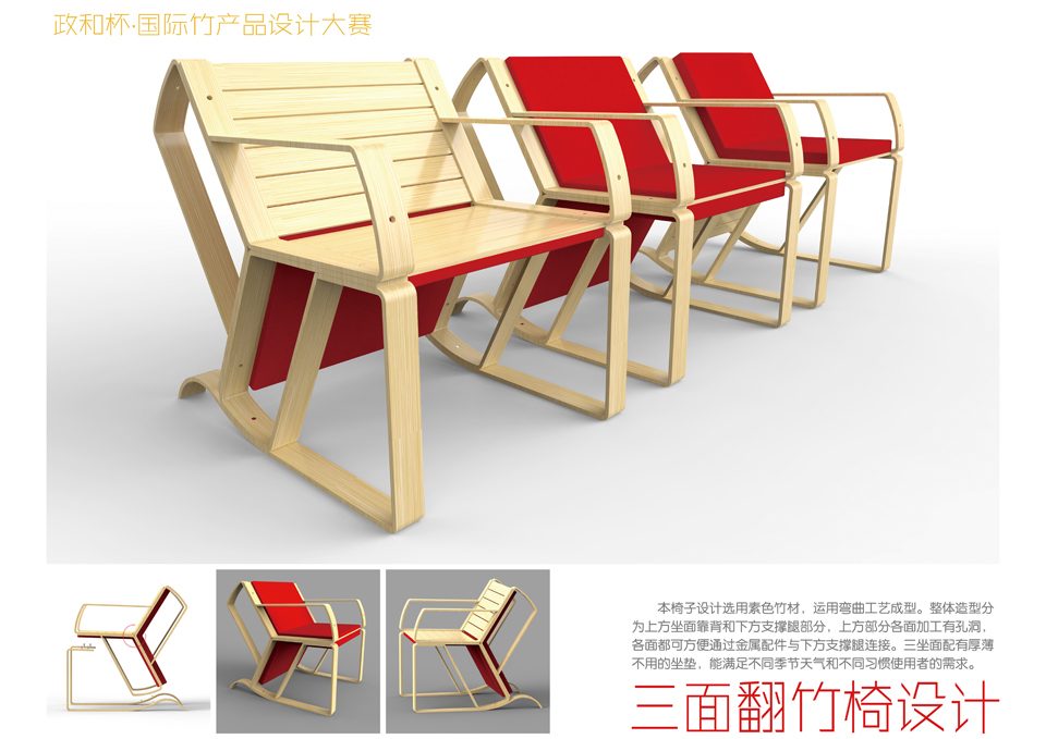 本椅子设计选用素色竹材,运用弯曲工艺成型。整体造型分为上方坐面靠背和下方支撑腿部分,上方部分各面加工有孔洞,各面都可方便通过金属配件与下方支撑腿连接。三坐面配有厚薄不用的坐垫,能满足不同季节天气和不同习惯使用者的需求。
