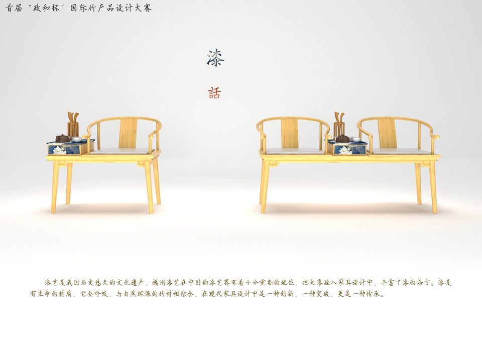 漆艺是我国历史悠久的文化遗产,福州漆艺在中国的漆艺界有着十分重要的地位,把大漆融入家具设计中,丰富了漆的语言。漆是有生命的材质,它会呼吸,与自然环保的竹材相结合,在现代家具设计中是一种创新,一种突破,更是一种传承。大漆,是一种有着深厚文化意义而遥远的材料。中国人使用大漆的历史长达7000余年,中国的传统从古至今,漆一直运用在人们的生活之中。明式家具的代表圈椅,这种“外圆内方”的造型人们审美标准下形成的。人与椅、人与漆、漆与椅,三者产生的共鸣,这或许就是悠然自在舒适的意境吧。